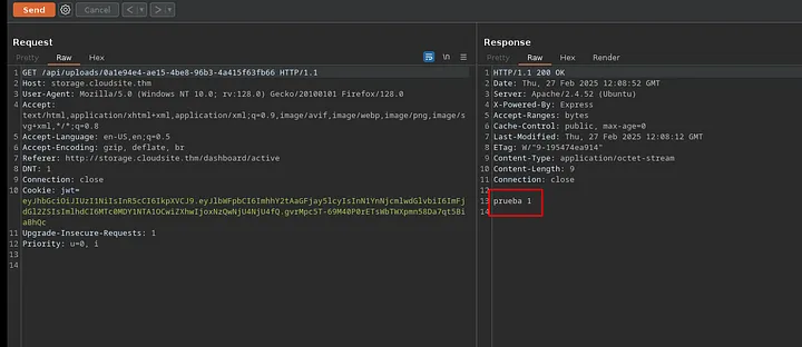 Cuando subimos el archivo y actualizamos la pagina nos da este mensaje, si le damos click e interceptamos la trama con Burp podemos ver que el contenido es visible.